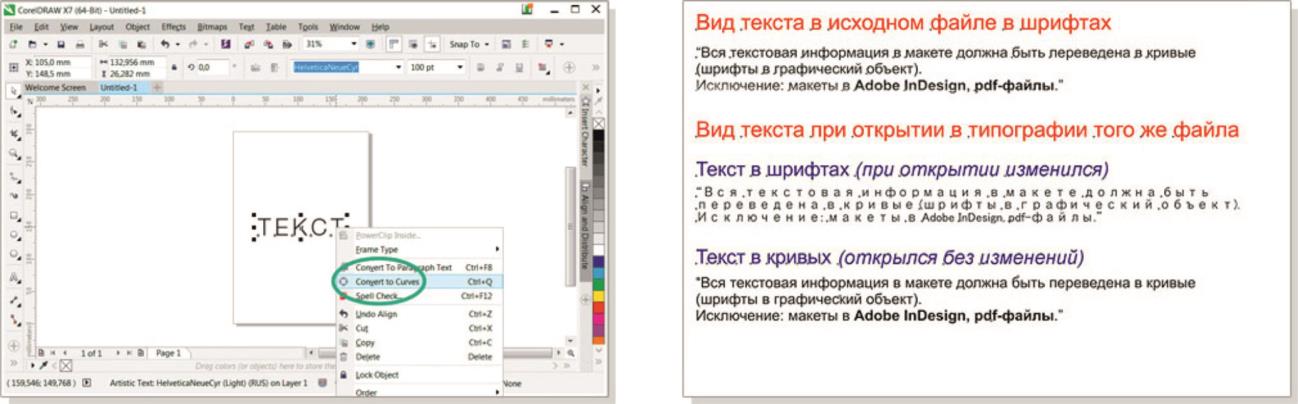 Вся текстовая информация в макете должна быть переведена в кривые (шрифты – в графический объект). Исключение составляют макеты в Adobe InDesign и pdf-файлы.