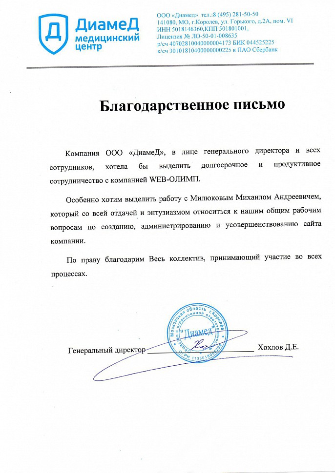 Компания ООО «ДиамеД», в лице генерального директора и всех сотрудников, хотела бы выделить долгосрочное и продуктивное сотрудничество с компанией WEB-ОЛИМП. Особенно хотим выделить работу с Милюковым Михаилом Андреевичем, который со всей отдачей и энтузиазмом относится к нашим общим рабочим вопросам по созданию, администрированию и усовершенствованию сайта компании. По праву благодарим Весь коллектив, принимающий участие во всех процессах.