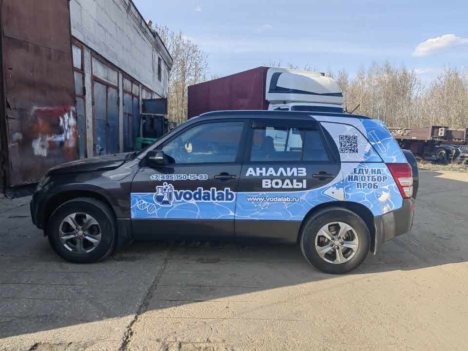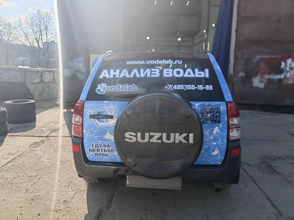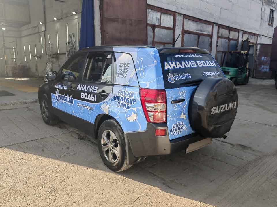 Полная оклейка автомобиля марки Suzuki пленкой Orajet с ламинацией Oraguard для компании по анализу воды.